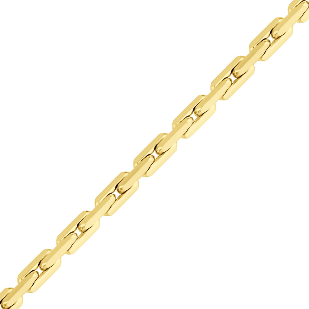 Звенья расположены под прямым углом друг к другу, поэтому цепь получается объемной. Плетение универсально, подходит и женщинам, и мужчинам. Классическая якорная цепь состоит из звеньев продолговатой формы с закругленными концами. Для усиления блеска края обрабатывают алмазной гранью. Цепь гибкая, прочная, фактурная. Ее лучше носить навыпуск — спрятать под одеждой сложно.